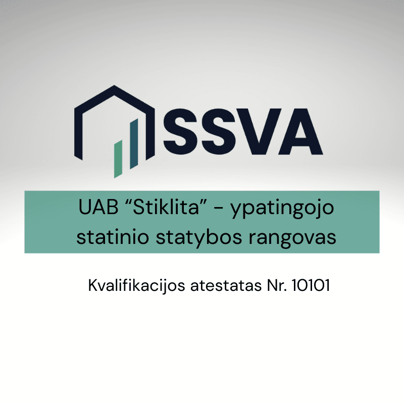 UAB „Stiklita” Suteikiama teisė būti ypatingojo statinio statybos rangovu.Statiniai:– pastatai (gyvenamieji ir negyvenamieji), taip pat minėti statiniai, esantys kultūros paveldo objekto teritorijoje, jo apsaugos zonoje, kultūros paveldo vietovėje.Statybos darbų sritys:– statybinių konstrukcijų (metalo be suvirinimo, medžio) statyba ir montavimas, stogų įrengimas, apdailos darbai.Atestatas suteiktas SSVA:https://is.ssva.lt/public/certificates/companies/review/4246